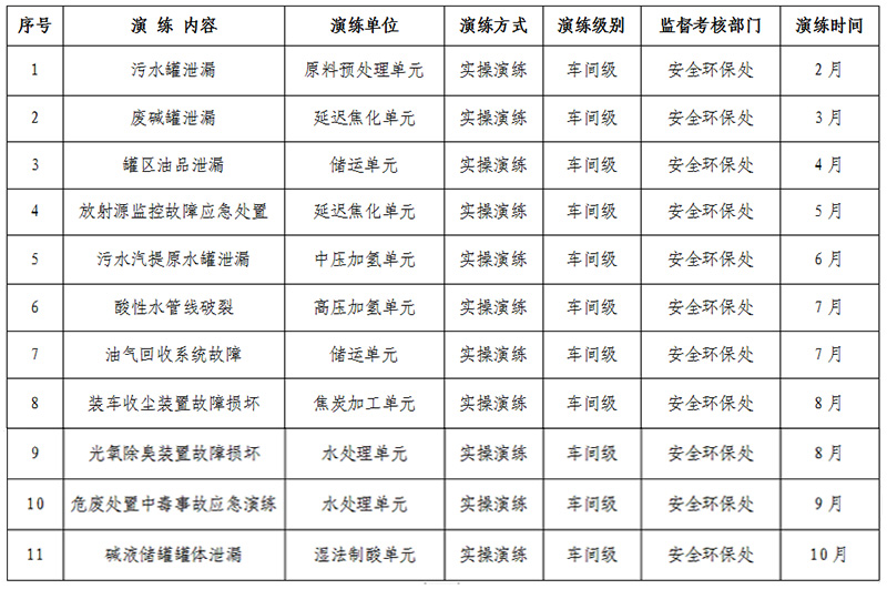 根据预案内容,我公司制订环保应急演练计划,并按照计划开展应急演练。截止2022年7月份,我公司开展的演练有污水罐泄漏事故演练、废碱罐泄漏事故演练、罐区油品泄漏事故演练、放射源监控故障应急处置事故演练、污水汽提原水罐泄漏事故演练、酸性水管线破裂事故演练、油气回收系统故障事故演练。演练计划及演练内容见附件。