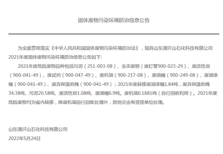为全面贯彻落实《中华人民共和国固体废物污染环境防治法》,现将山东清沂山石化科技有限公司2021年度固体废物污染环境防治信息公告如下: